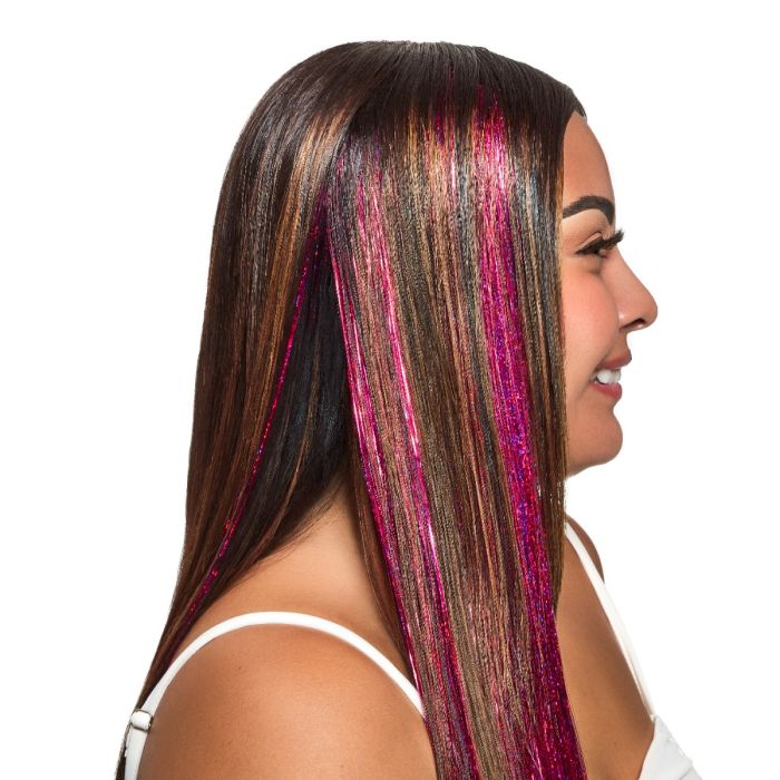 Unleash the ultimate in hair glamour with Mane Tinsel Pink Opulence! This exquisite tinsel features reflective pink bursts that light up your hair with a dazzling shine, complemented by subtle hints of purple for a multidimensional effect. Each strand captures and amplifies light, creating a stunning interplay of color that’s both vibrant and elegant. Ideal for adding a touch of playful sophistication to any style, Pink Opulence effortlessly clips in and won’t damage your hair. Whether you're gearing up for a special event, a night out, or simply want to add a bit of luxury to your everyday look, this tinsel ensures your hair sparkles with a unique blend of pink radiance and purple depth. Embrace the opulence and let your mane shimmer with captivating brilliance!