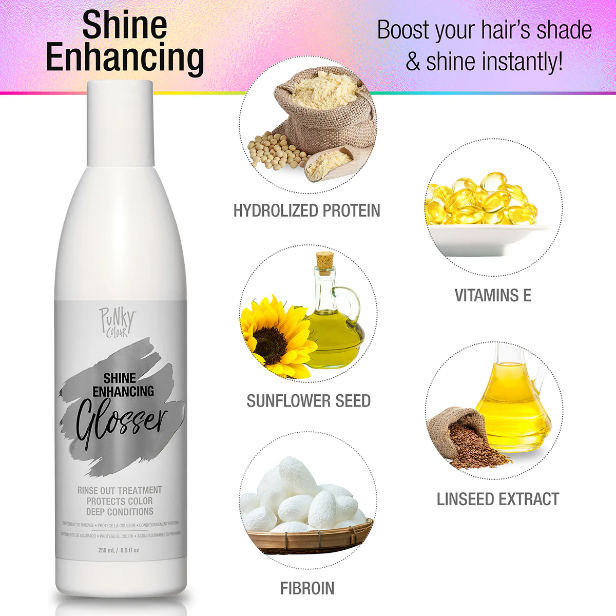 - Gloss It Up; Say bye to dull, lifeless locks! Shine in power with every Punky Colour Shine Enhancing Glosser application. From drab to fab in seconds flat! Sick of your colors fading and losing that x factor? This baby's got your back. A hair color protector and conditioner rolled into one dynamite package! Just keep on glowing.